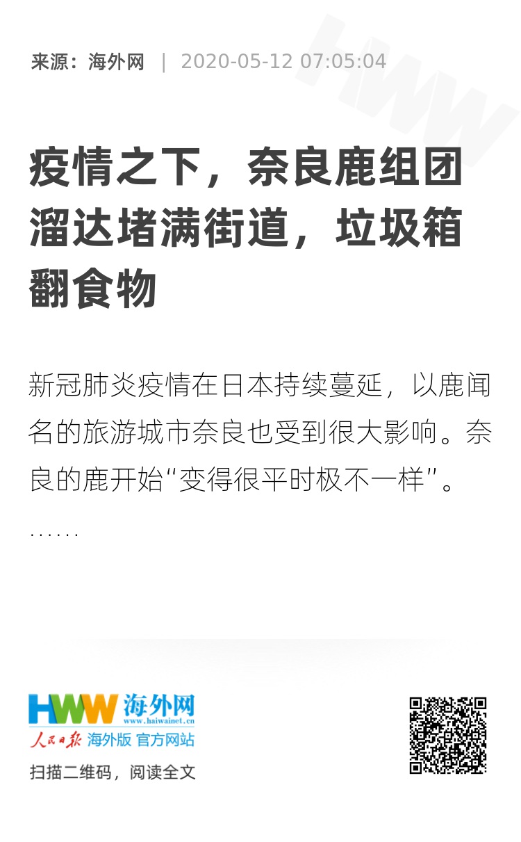 【海外网5月12日|战疫全时区】新冠肺炎疫情在日本持续蔓延,以鹿闻名的旅游城市奈良也受到很大影响。从1月下旬疫情出现以来,游客骤减,奈良的鹿开始“变得很平时极不一样”,组团上街溜达,在垃圾桶翻找食物......有居民表示“住奈良这么多年从没见过”。