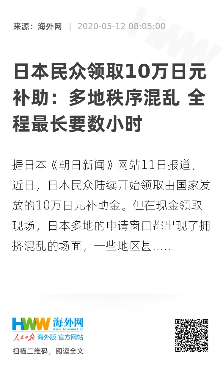 【海外网5月12日|战疫全时区】据日本《朝日新闻》网站11日报道,近日,日本民众陆续开始领取由国家发放的10万日元补助金。但在现金领取现场,日本多地的申请窗口都出现了拥挤混乱的场面,一些地区甚至被迫取消了现场办理业务。