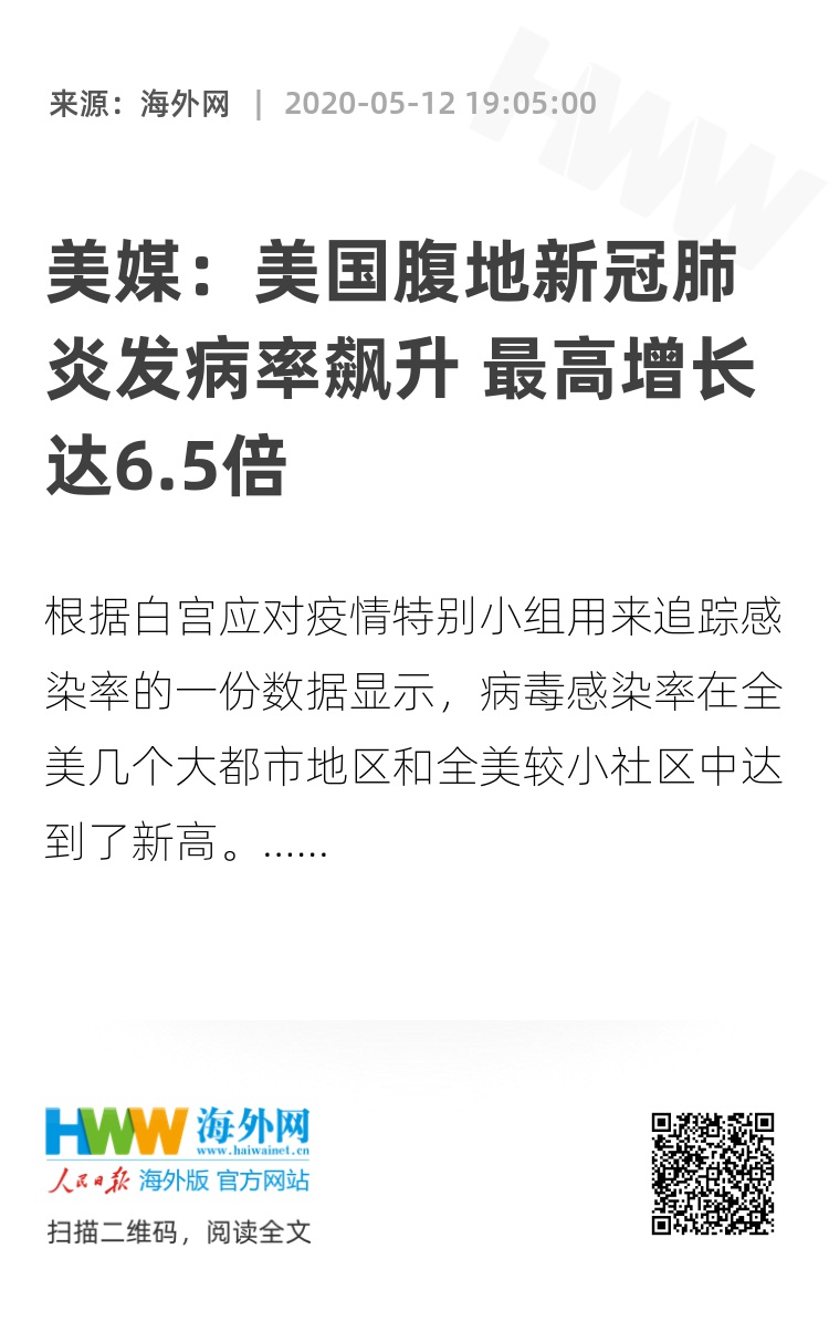 【海外网5月12日|战疫全时区】根据白宫应对疫情特别小组用来追踪感染率的一份数据显示,病毒感染率在全美几个大都市地区和全美较小社区中达到了新高。这与美国政府周一(11日)宣布的“在全国各地,这一数字正在迅速下降”的说法不一致。
