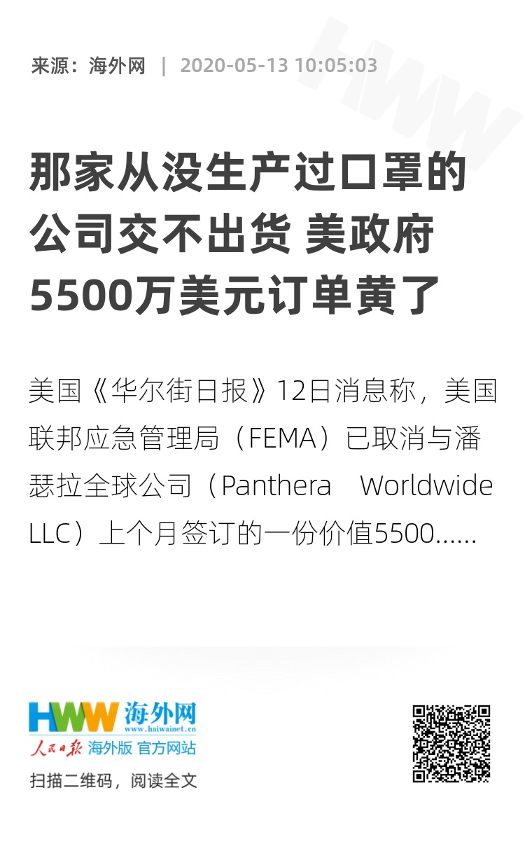 【海外网5月13日|战疫全时区】上个月,美国政府签署的一笔5500万美元口罩订单曾引发外界质疑,对方公司是一家从未生产过口罩的公司,价格还比其他口罩制造商高很多,且这家公司的母公司已于去年宣布破产。结果,最新的后续来了:该公司始终无法按时交货,这笔口罩订单就这样黄了。