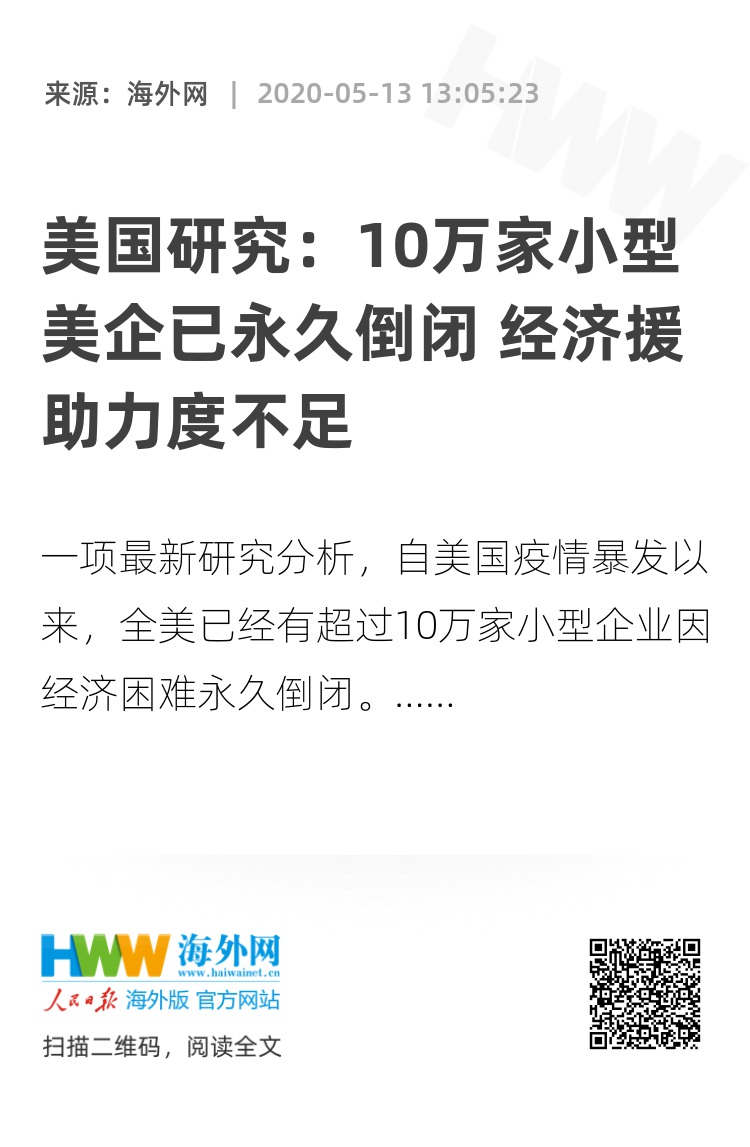 【海外网5月13日|战疫全时区】美国一项最新研究分析,自美国疫情暴发以来,全美已经有超过10万家小型企业因经济困难而永久倒闭。美媒指出,虽然美国政府和国会已经出台了相关经济援助计划,但是众多小型企业经营者都表示政策的力度和部分细节存在不足,难以满足他们的需求。