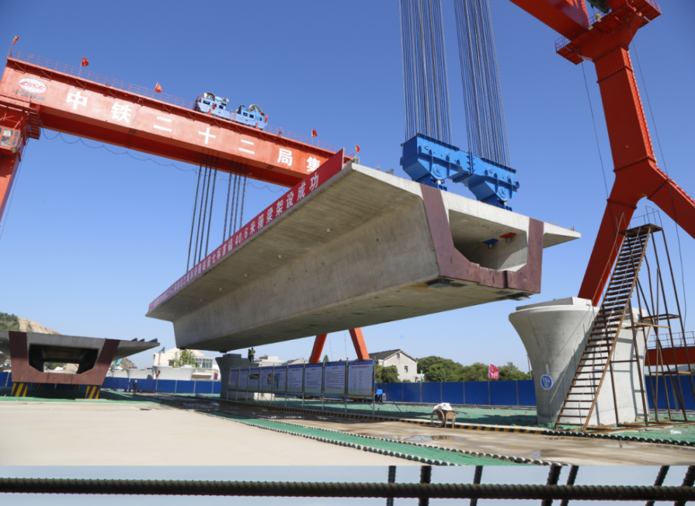 5月12日,南沿江城际建设跨疏港特大桥13号至14号桥墩之间,中国铁建建设者驾驶着两台超级架桥机,即我国自主研制的高铁施工装备——40米跨1000吨运架成套设备,成功将第一片长40米的千吨高铁箱梁稳稳放置于梁上。这是国内第一条大规模采用千吨箱梁的高铁工程,是中国高铁重大科研创新成果——《高速铁路大跨度简支箱梁建造关键技术研究—提运架设备》的正式工程化应用。