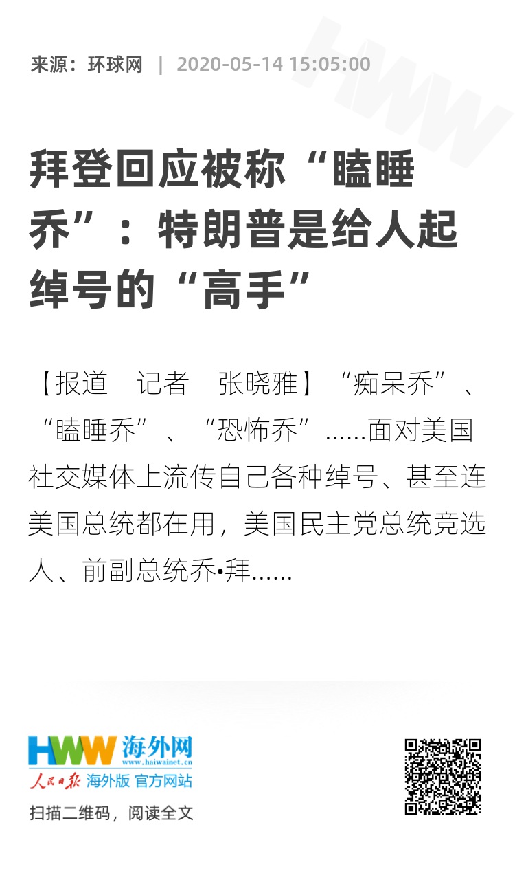 福克斯新闻称,汉比问拜登,会如何回应那些称他为“痴呆乔”(Dementia Joe)、“瞌睡乔”(Sleepy Joe)和“恐怖乔”(creep Joe)等的表情包。↓
