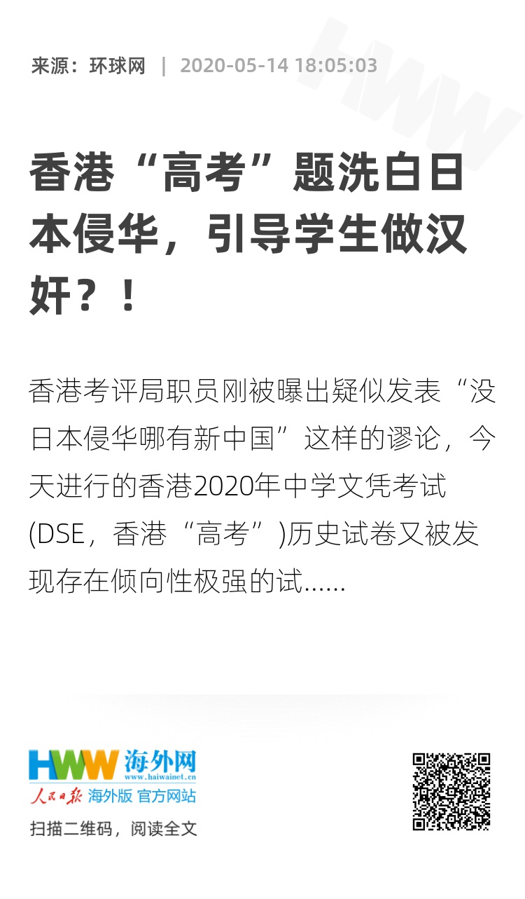 香港考评局职员刚被曝出疑似发表“没日本侵华哪有新中国”这样的谬论,今天进行的香港2020年中学文凭考试(DSE,香港“高考”)历史试卷又被发现存在倾向性极强的试题,香港教联会副主席穆家骏质疑这是在“引导学生做汉奸”。