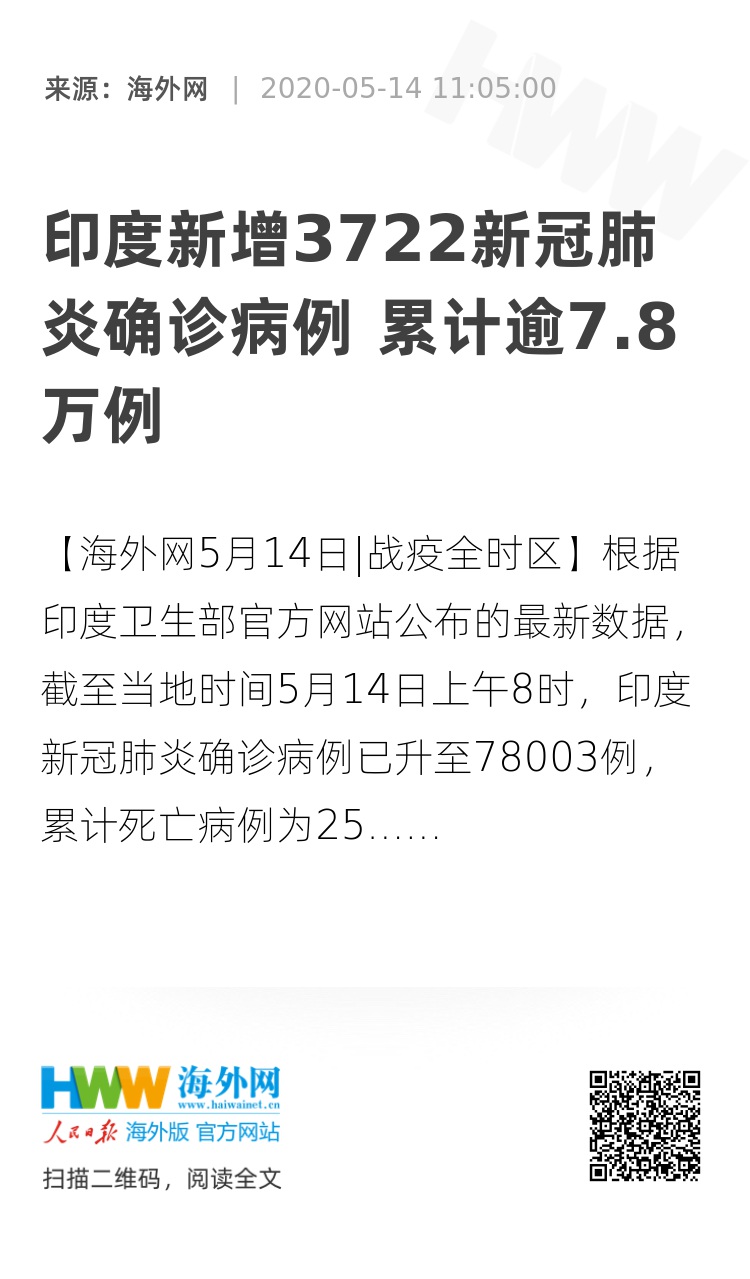 【海外网5月14日|战疫全时区】根据印度卫生部官方网站公布的最新数据,截至当地时间5月14日上午8时,印度新冠肺炎确诊病例已升至78003例,累计死亡病例为2549例。在过去24小时内,印度新增确诊病例3722例,新增死亡病例134例。目前,印度为全球确诊病例数第12多的国家。