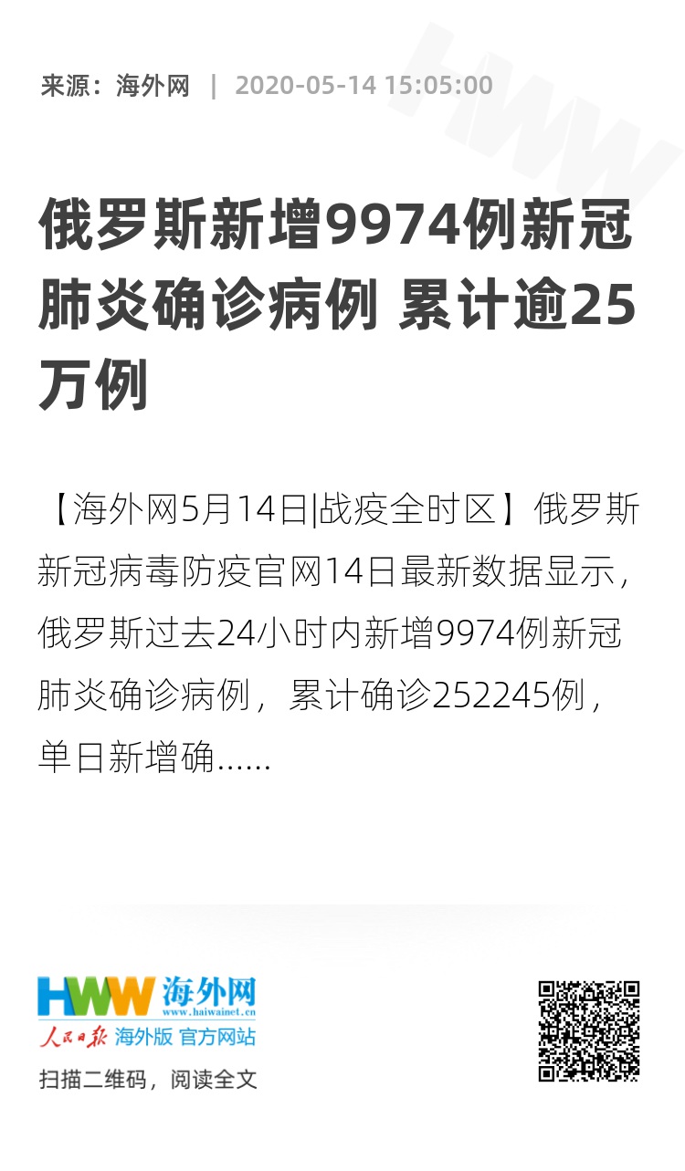 【海外网5月14日|战疫全时区】俄罗斯新冠病毒防疫官网14日最新数据显示,俄罗斯过去24小时内新增9974例新冠肺炎确诊病例,累计确诊252245例,单日新增确诊病例在连续11天过万后首次下降;新增死亡病例93例,累计死亡2305例。