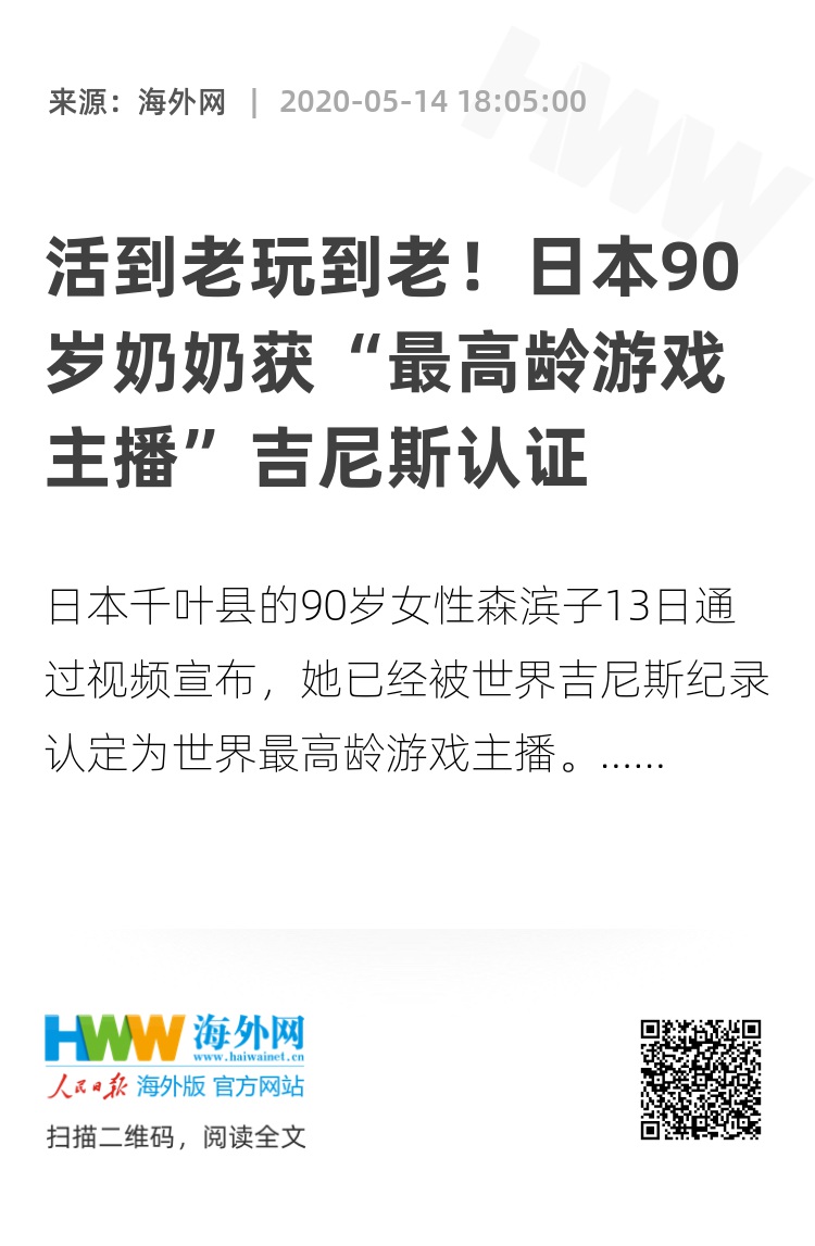 【海外网5月14日编译报道】综合吉尼斯官方网站、日本livedoor网站报道,日本千叶县的90岁女性森滨子13日通过视频宣布,她已经被世界吉尼斯纪录认定为世界最高龄游戏主播。她从39年前就开始玩游戏,2014年开始定期发布自己玩游戏的视频,最火的一个视频播放量高达333万。