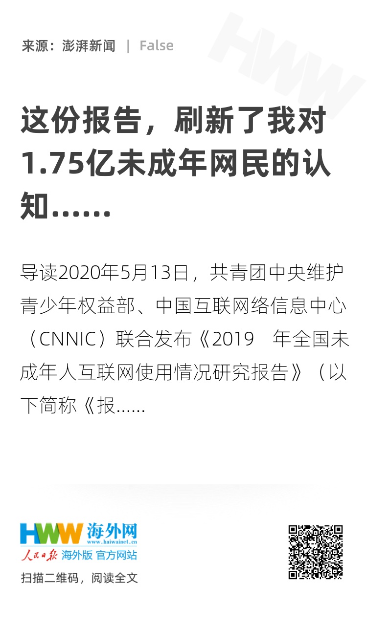 2020年5月13日,共青团中央维护青少年权益部、中国互联网络信息中心(CNNIC)联合发布《2019 年全国未成年人互联网使用情况研究报告》(以下简称《报告》) 。 《报告》基于对全国31个省(区、市)的小学、初中、高中及中等职业学校34661名学生的抽样调查,从未成年人互联网接入环境、互联网使用、网络素养教育、网络安全与防护等方面,展示了当前我国未成年人的互联网使用特点和网上生活状态。