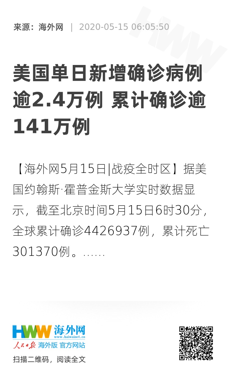 【海外网5月15日|战疫全时区】据美国约翰斯·霍普金斯大学实时数据显示,截至北京时间5月15日6时30分,全球累计确诊4426937例,累计死亡301370例。其中美国累计确诊1413012例,死亡85581例。与前一日6时30分数据相比,美国新增确诊病例24076例,新增死亡病例1790例。