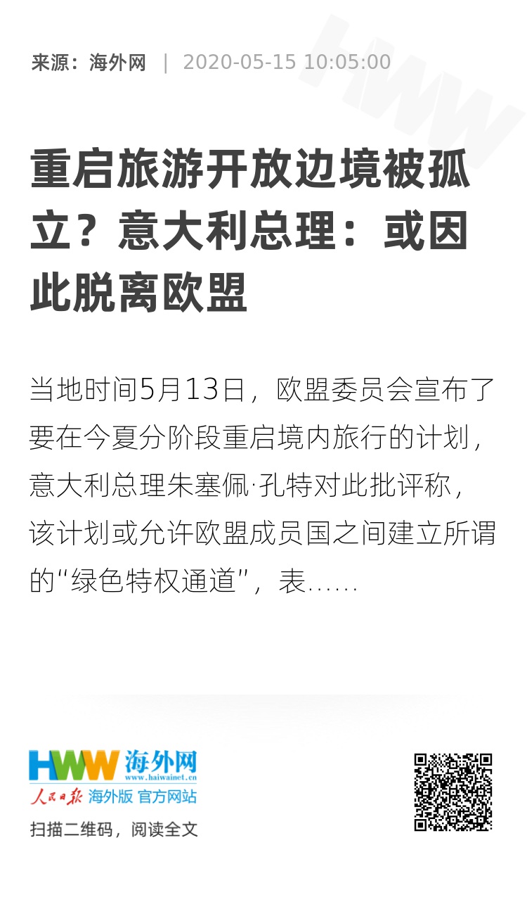 【海外网5月15日|战疫全时区】当地时间5月13日,欧盟委员会宣布了要在今夏分阶段重启境内旅行的计划,意大利总理朱塞佩·孔特对此批评称,该计划或允许欧盟成员国之间建立所谓的“绿色特权通道”,表示这可能会导致意大利脱离欧盟。