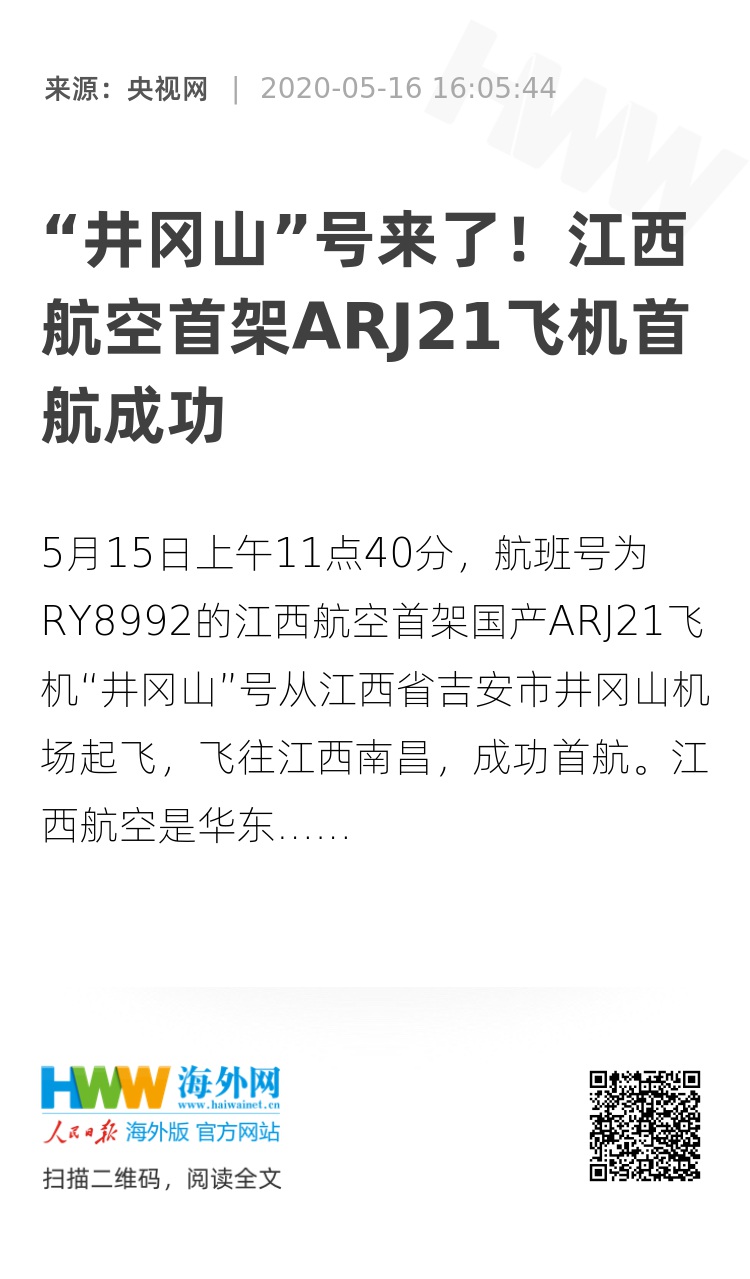 5月15日上午11点40分,航班号为RY8992的江西航空首架国产ARJ21飞机“井冈山”号从江西省吉安市井冈山机场起飞,飞往江西南昌,成功首航。江西航空是华东地区首家运营国产支线飞机的航空公司。这次江西航空ARJ21飞机首航成功是中国支线客机产业发展迈出的重要一步。