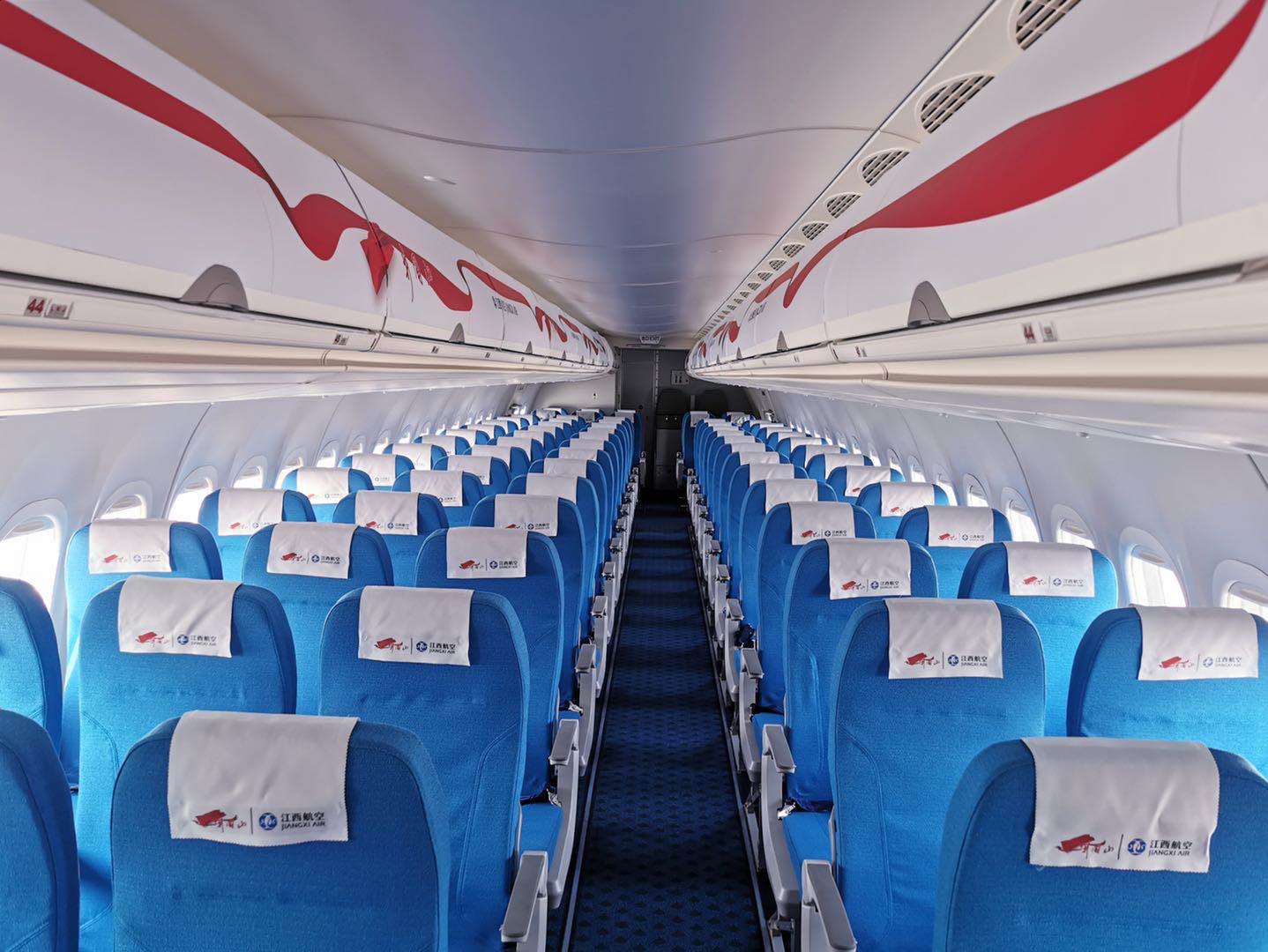 ARJ21飞机客舱内设五排座,高度超过2米,接近干线飞机的高度。座位间宽敞,乘坐舒适度高,腿部完全伸得开。