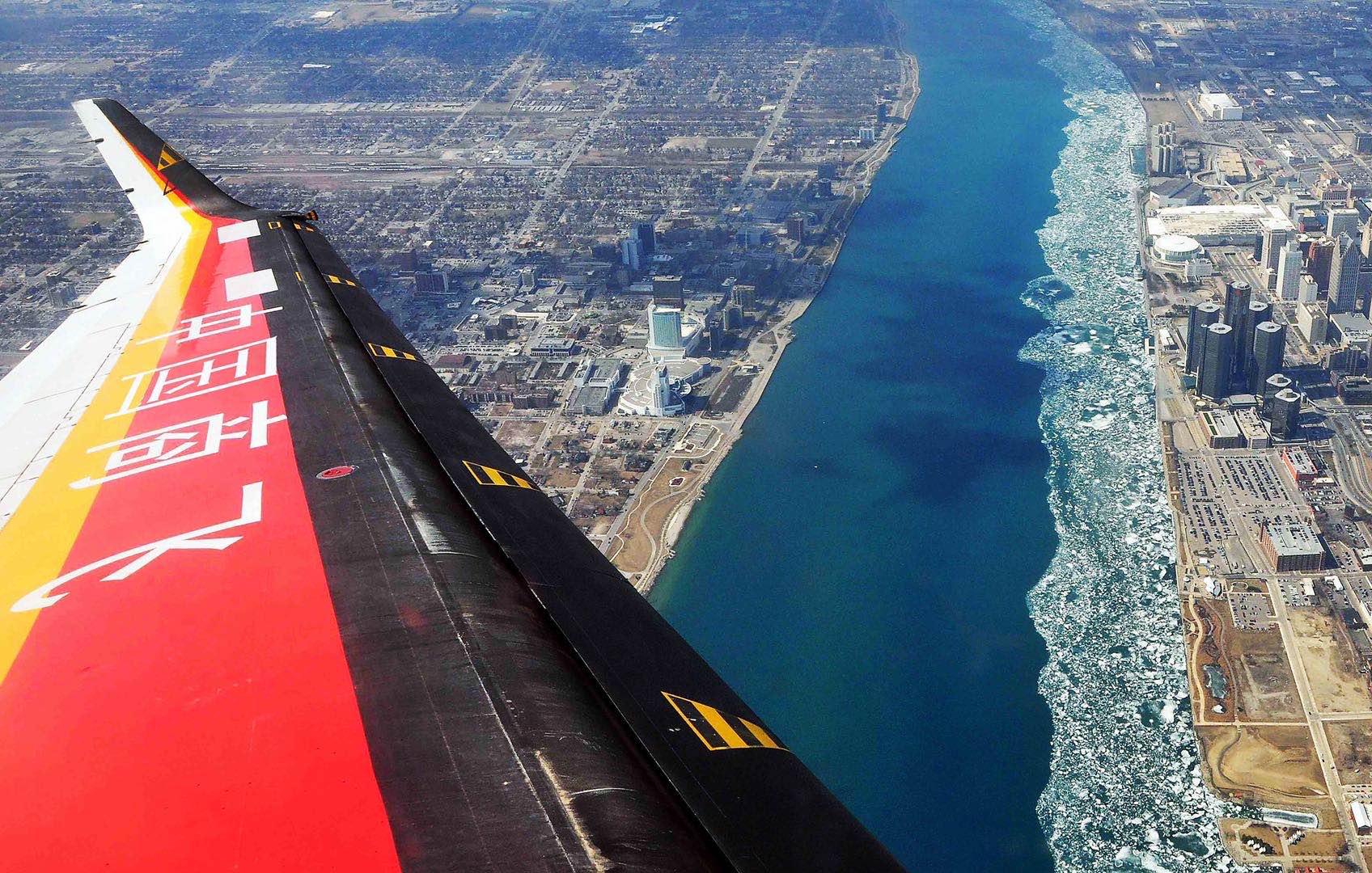 ARJ21飞机翱翔在底特律河上空