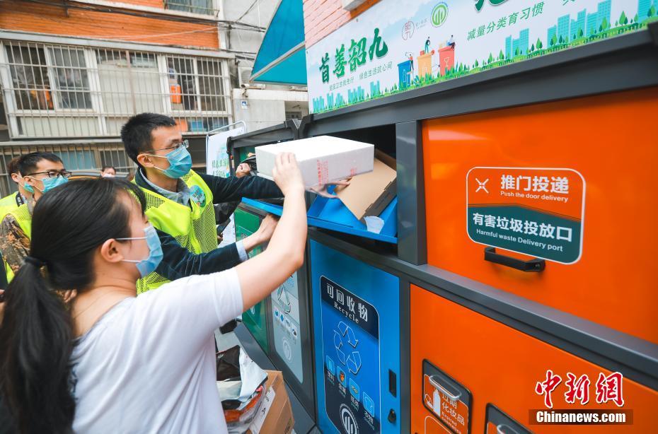 5月17日,社区居民在志愿者的指导下向智能垃圾箱投放可回收垃圾。当日,北京市东城区东华门街道韶九社区锡拉胡同21号院正式启动生活垃圾精细化管理项目,设立四分类智能垃圾箱,并向居民免费提供二维码溯源垃圾袋,引导居民养成垃圾分类良好习惯。中新社记者 贾天勇 摄