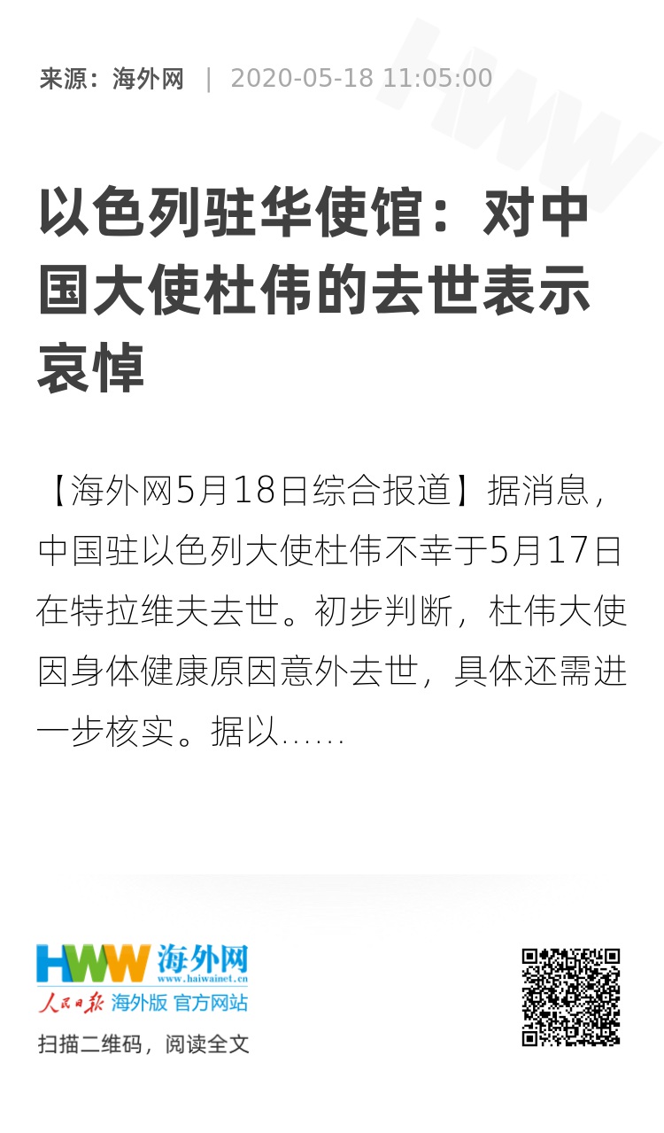 据以色列驻华大使馆官方微信公号消息,以色列驻华大使馆表示,中国驻以色列大使杜伟阁下不幸于5月17日在以色列去世,我们对杜大使的去世表示哀悼,向其家人表示最诚挚的慰问。