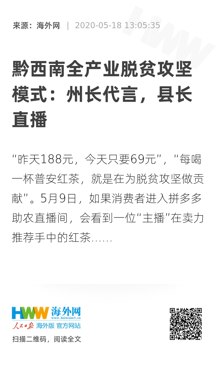 “这场助农扶贫直播彻底点燃了黔西南的电商热情”,“以前老是觉得电商很遥远,这次州长、县长直播带货,一天的零售成绩几乎是以前一两个月的。更重要的是,发现电商没有想象中那么难”,贫困县晴隆农产品龙头企业负责人陈天兵说。