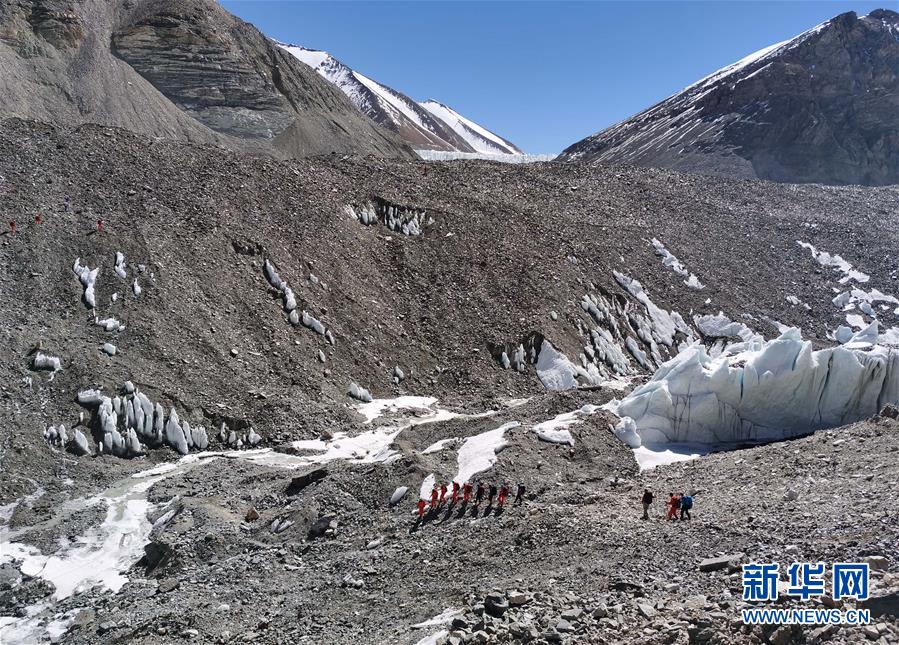 2020珠峰高程测量登山队在前往海拔6500米的前进营地途中(5月17日摄)。 5月17日11时左右,2020珠峰高程测量登山队从海拔5800米的过渡营地出发,用时近5个小时,到达海拔6500米的珠峰前进营地。据2020珠峰高程测量登山队队长次落介绍,5月18日,队伍将在前进营地进行休整,并将对人员进行分工,计划成立冲顶组、支援组、接应组,召开冲顶前的分工会议和动员大会。 新华社特约记者 拉巴 摄