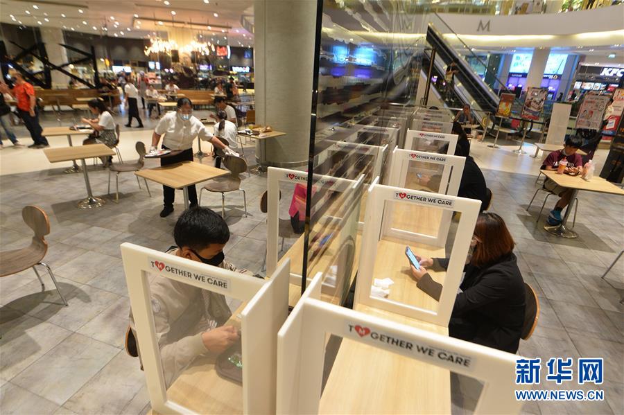 泰国政府15日宣布,于17日重新开放商场和室内餐厅,同时宵禁时间自17日起缩短一个小时,改为每日23时至次日早上4时。新华社发 (拉亨 摄)