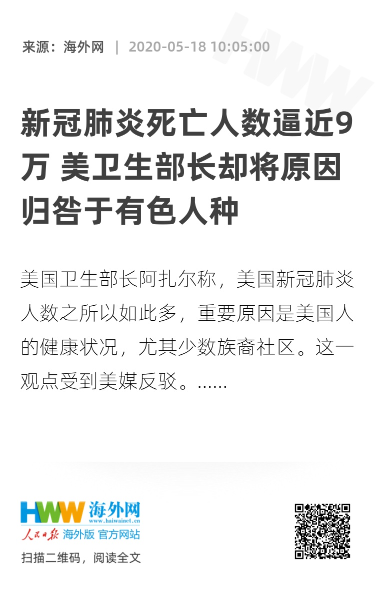 【海外网5月18日|战疫全时区】当地时间17日,美国卫生与公众服务部部长亚历克斯·阿扎尔 (Alex Azar)在接受美媒采访时称,美国新冠肺炎人数之所以如此多,重要原因是美国人的健康状况,尤其少数族裔社区。这一观点受到美媒反驳。