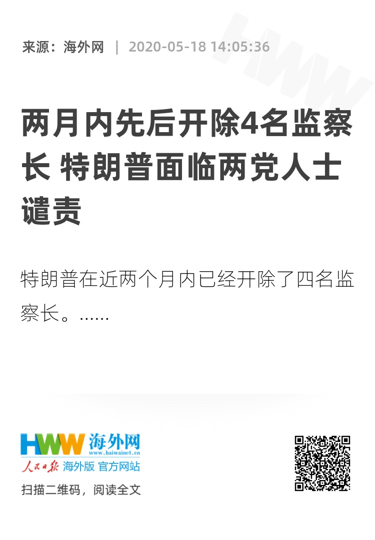【海外网5月18日|战疫全时区】当地时间15日,美国总统特朗普突然宣布解雇美国国务院监察长史蒂夫·利尼克,这已经是他在近两个月内开除的第四名监察长。上周末,来自国会两党的多名人士纷纷对特朗普表示批评,指责其解雇多位监察长的行为缺少正当理由,并试图以此掩盖政府失职。