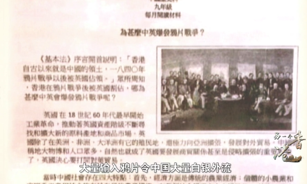 这是《大公报》披露的一张来自香港浸会大学附属学校王锦辉中小学“《中国历史》配套阅读材料”截图。在关于《为什么中英爆发鸦片战争?》这篇文章中,只字不提英国大量输入鸦片令中国大量白银外流、鸦片毒祸令中国人沉沦,反指中国“傲慢”,将战争化为两国政治、贸易体制和司法制度的冲突。