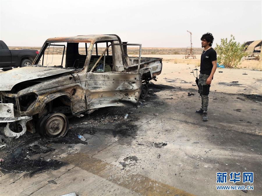 5月18日,在位于利比亚首都的黎波里西南约140公里处的瓦提耶空军基地,一名利比亚民族团结政府武装人员站在损毁的汽车旁。 新华社发(哈姆扎·图尔基亚摄)