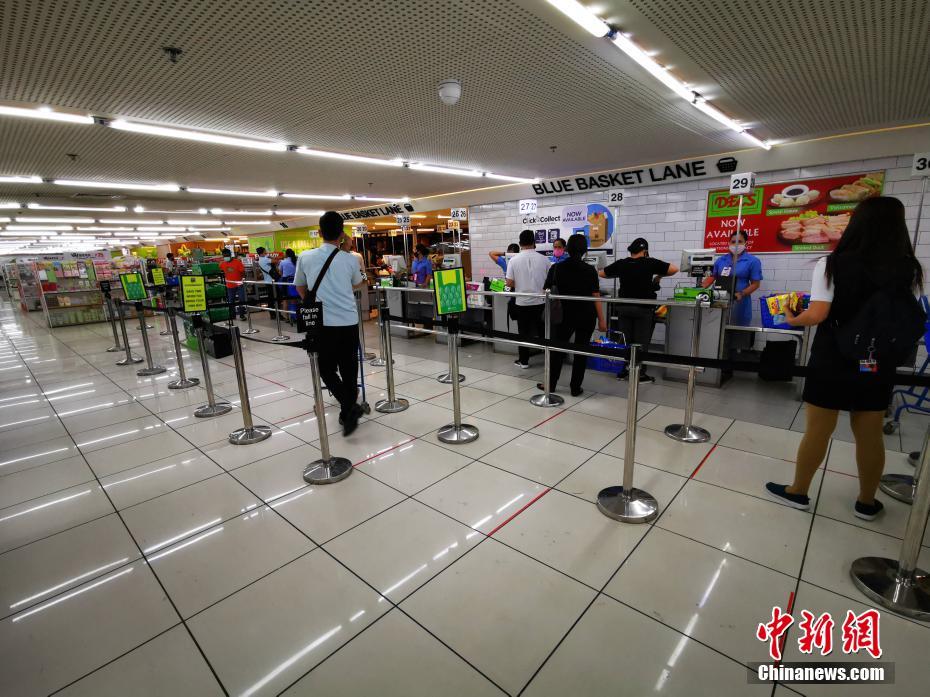 5月18日,是马尼拉结束62天的“强化性区隔离(ECQ)”,进入15天“改良性强化社区隔离(MECQ)”后的第一个工作日。图为菲律宾著名连锁商场SM马尼拉CBD马卡蒂店大型超市内,顾客保持一定的距离排队等候结账。 中新社记者 关向东 摄