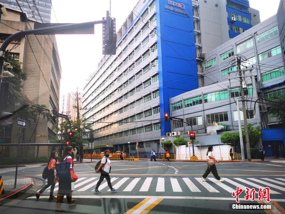 5月18日,是马尼拉结束62天的“强化性区隔离(ECQ)”,进入15天“改良性强化社区隔离(MECQ)”后的第一个工作日。图为马尼拉CBD马卡蒂,行人带着口罩过人行道。 中新社记者 关向东 摄