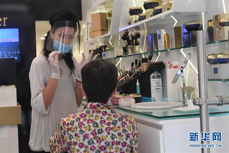 5月18日,意大利博洛尼亚一家化妆品店的店员为顾客试妆。 意大利18日开始大幅放松疫情管控措施,商店、餐厅、理发馆、博物馆等重新开放,但商家和顾客都必须遵守有关安全距离和消毒等方面的严格规定。 新华社发(詹尼·斯基基摄)