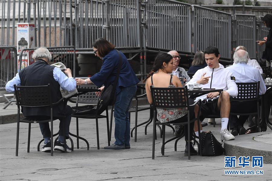 5月18日,人们在意大利博洛尼亚一家咖啡店喝咖啡。 意大利18日开始大幅放松疫情管控措施,商店、餐厅、理发馆、博物馆等重新开放,但商家和顾客都必须遵守有关安全距离和消毒等方面的严格规定。 新华社发(詹尼·斯基基摄)
