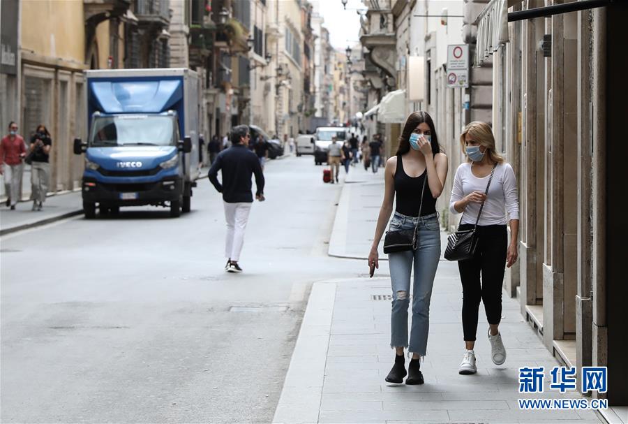 5月18日,两名女子在意大利首都罗马孔多蒂街逛街。 意大利18日开始大幅放松疫情管控措施,商店、餐厅、理发馆、博物馆等重新开放,但商家和顾客都必须遵守有关安全距离和消毒等方面的严格规定。 新华社记者 程婷婷 摄