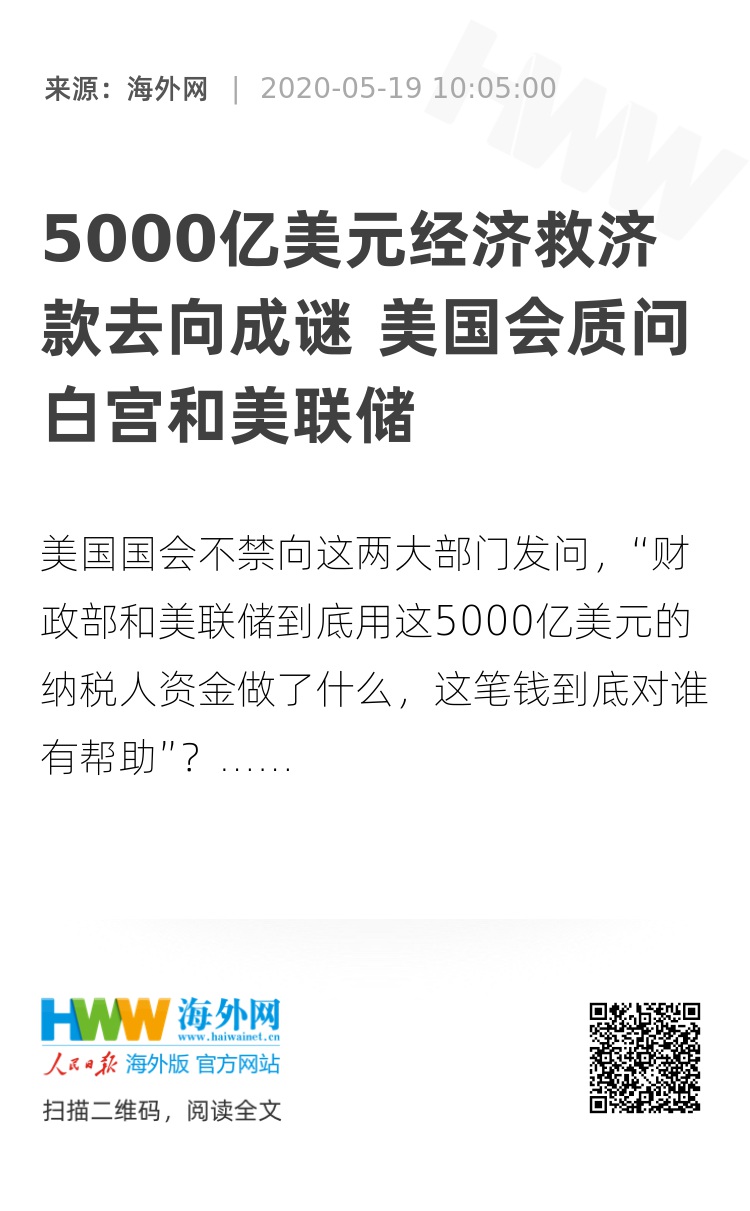 【海外网5月19日|战疫全时区】日前,一项于4月底批准的支出法案引起美国国会注意,该法案指定拨出5000亿美元(约合人民币3.5万亿元)用于救济受新冠肺炎疫情影响的美国经济。然而国会却发现,美国财政部和美联储似乎并未充分利用这笔救济款。