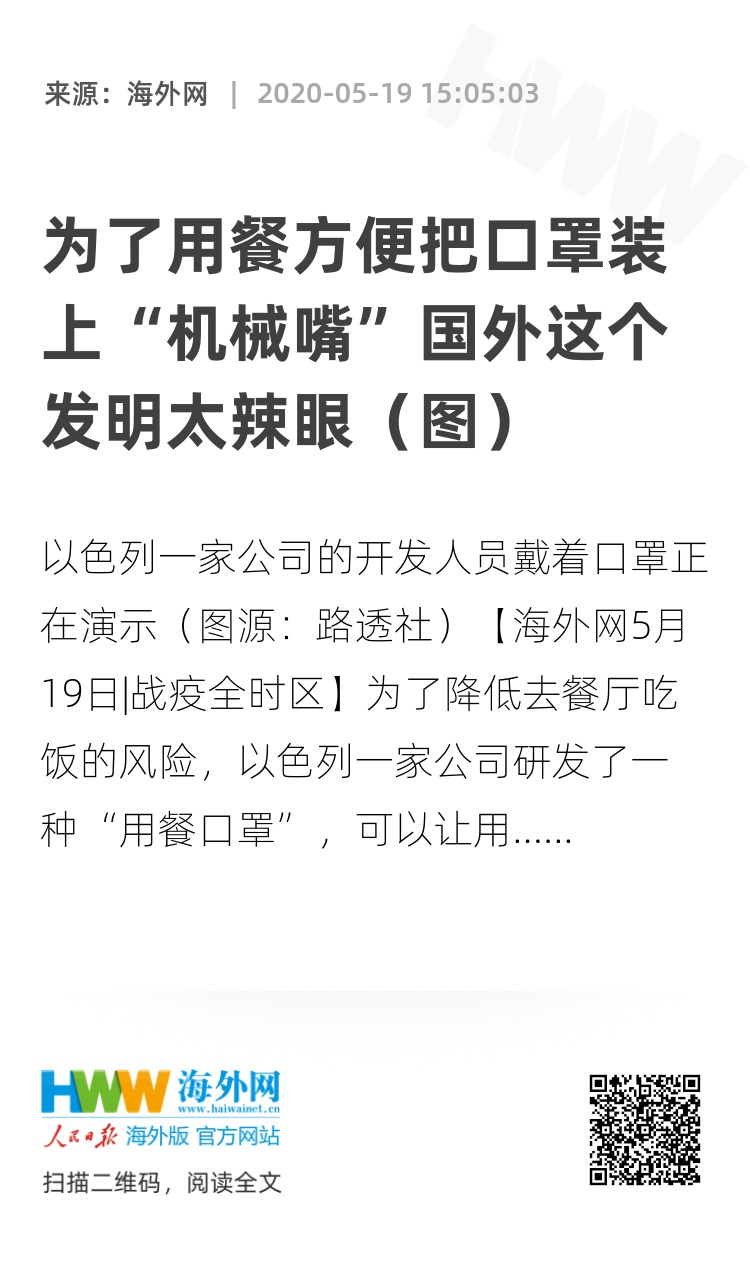 【海外网5月19日|战疫全时区】为了降低去餐厅吃饭的风险,以色列一家公司研发了一种“用餐口罩”,可以让用餐者不用取下口罩就能进食。