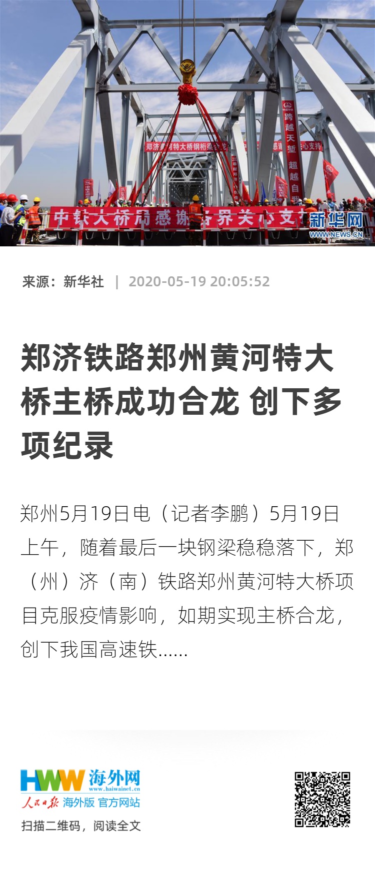 新华社郑州5月19日电(记者李鹏)5月19日上午,随着最后一块钢梁稳稳落下,郑(州)济(南)铁路郑州黄河特大桥项目克服疫情影响,如期实现主桥合龙,创下我国高速铁路无砟轨道钢混叠合连续钢桁梁大桥中长度最长、跨度最大、设计时速最高等三项纪录。
