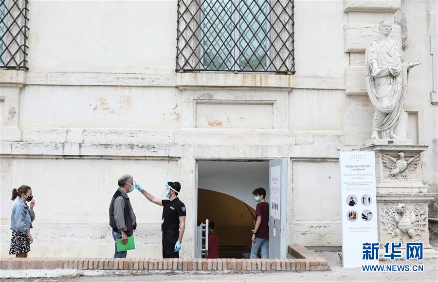 5月20日,在意大利首都罗马,重新开放的博尔盖塞美术博物馆工作人员给参观者测量体温。 意大利民事保护部20日发布的数据显示,该国新冠疫情继续缓解,当天现有患者比前一天减少2377人,降至62752人;新增治愈病例2881例,累计治愈132282例。 新华社记者 程婷婷 摄
