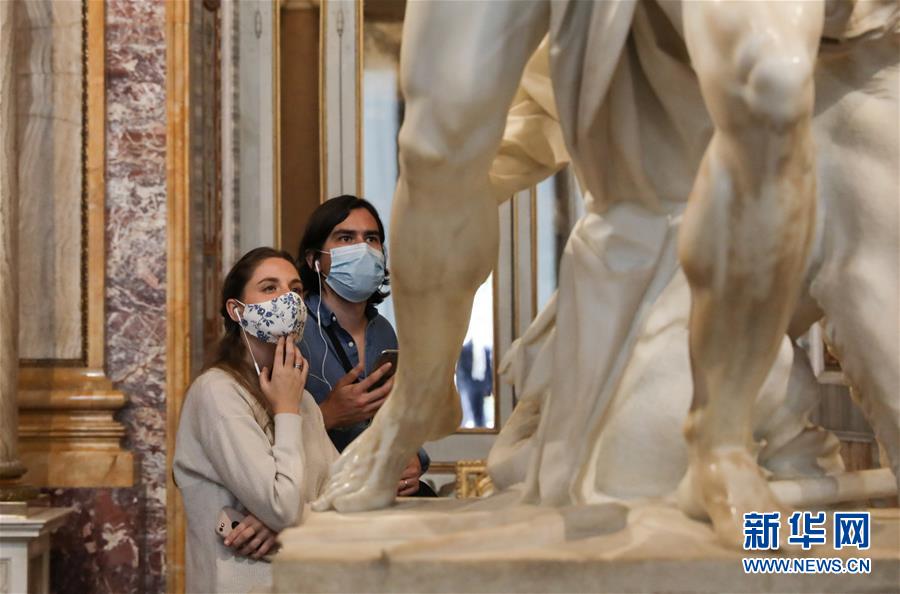 5月20日,在意大利首都罗马,人们戴着口罩参观重新开放的博尔盖塞美术博物馆。 意大利民事保护部20日发布的数据显示,该国新冠疫情继续缓解,当天现有患者比前一天减少2377人,降至62752人;新增治愈病例2881例,累计治愈132282例。 新华社记者 程婷婷 摄
