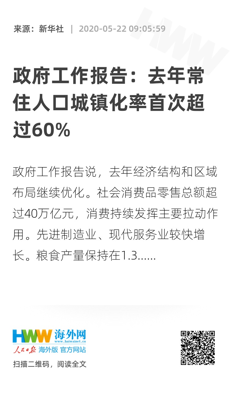 政府工作报告说,去年经济结构和区域布局继续优化。社会消费品零售总额超过40万亿元,消费持续发挥主要拉动作用。先进制造业、现代服务业较快增长。粮食产量保持在1.3万亿斤以上。常住人口城镇化率首次超过60%,重大区域战略深入实施。