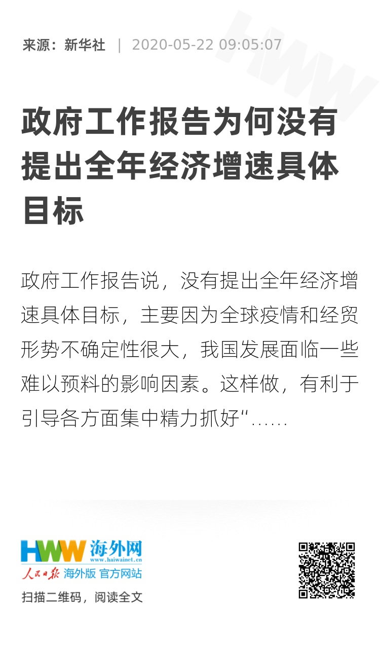 政府工作报告说,没有提出全年经济增速具体目标,主要因为全球疫情和经贸形势不确定性很大,我国发展面临一些难以预料的影响因素。这样做,有利于引导各方面集中精力抓好“六稳”、“六保”。“六保”是今年“六稳”工作的着力点。守住“六保”底线,就能稳住经济基本盘;以保促稳、稳中求进,就能为全面建成小康社会夯实基础。