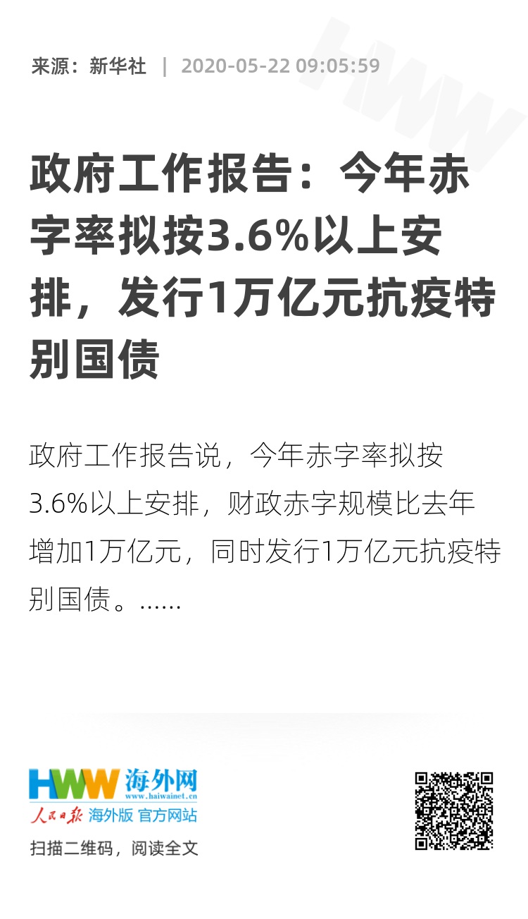 政府工作报告:今年赤字率拟按3.6%以上安排,发行1万亿元抗疫特别国债