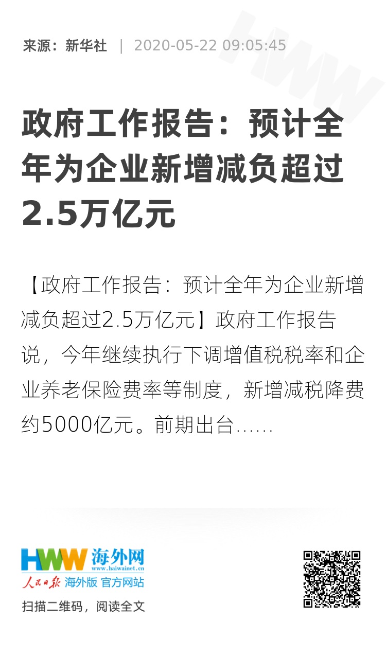 31795768,.政府工作报告:预计全年为企业新增减负超过2.5万亿元,.2020-05-22 09:37:45,.204232,.朱箫