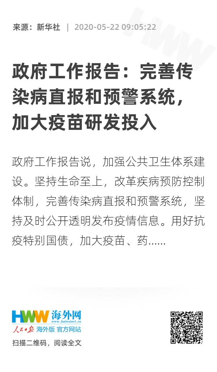政府工作报告说,加强公共卫生体系建设。坚持生命至上,改革疾病预防控制体制,完善传染病直报和预警系统,坚持及时公开透明发布疫情信息。用好抗疫特别国债,加大疫苗、药物和快速检测技术研发投入,增加防疫救治医疗设施,增加移动实验室,强化应急物资保障,强化基层卫生防疫。