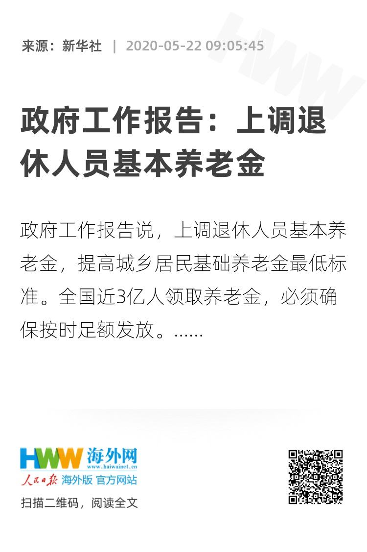 政府工作报告说,上调退休人员基本养老金,提高城乡居民基础养老金最低标准。全国近3亿人领取养老金,必须确保按时足额发放。