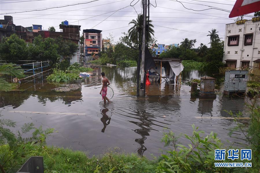 5月21日,在印度加尔各答,一名男子在雨后积水的地面捕鱼。新华社发