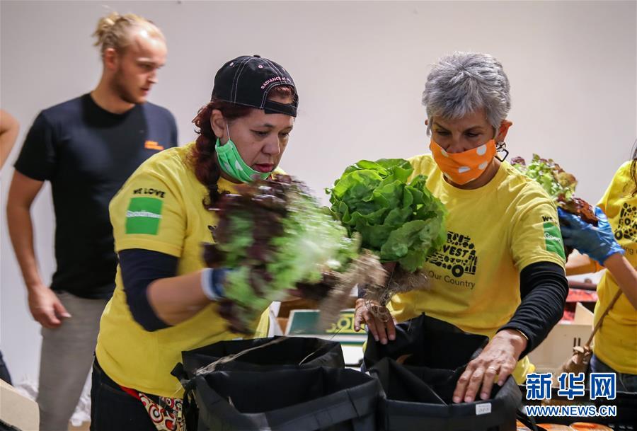 5月21日,在澳大利亚悉尼环形码头,工作人员配置救济食品。 当日,悉尼市政府向受疫情影响的海外留学生和临时签证持有者发放救济食品。 新华社记者 白雪飞 摄