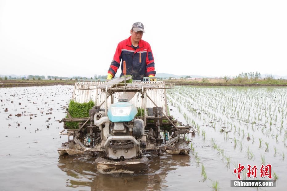 5月22日,哈尔滨市尚志市河东东安水稻种植专业合作社种植基地进入最后的水稻插秧阶段。新冠肺炎疫情期间,黑龙江省全力保春耕。目前,春播总体进度快于上年同期,水田插秧已超八成。图为种植基地的农民使用小型插秧机作业。 中新社记者 吕品 摄