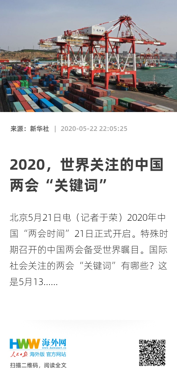 新华社北京5月21日电(记者于荣)2020年中国“两会时间”21日正式开启。特殊时期召开的中国两会备受世界瞩目。国际社会关注的两会“关键词”有哪些?