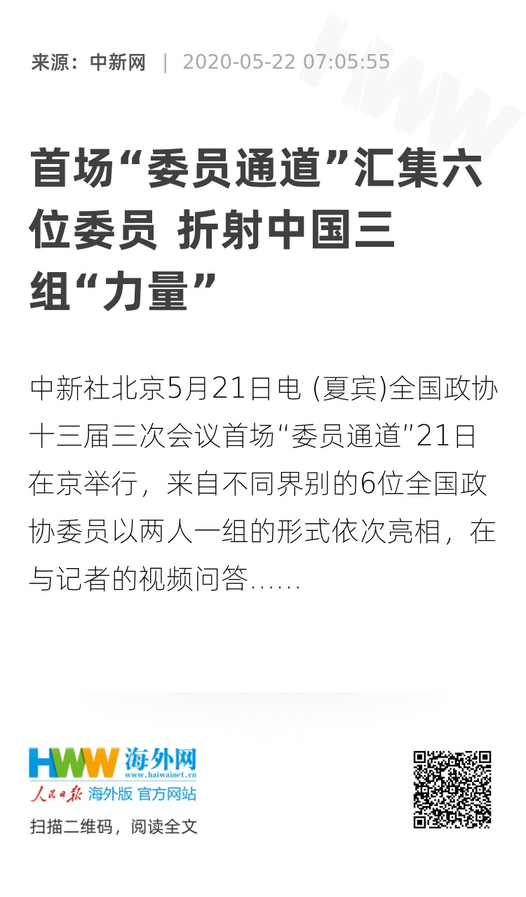 中新社北京5月21日电 (夏宾)全国政协十三届三次会议首场“委员通道”21日在京举行,来自不同界别的6位全国政协委员以两人一组的形式依次亮相,在与记者的视频问答间折射出三组“力量”。