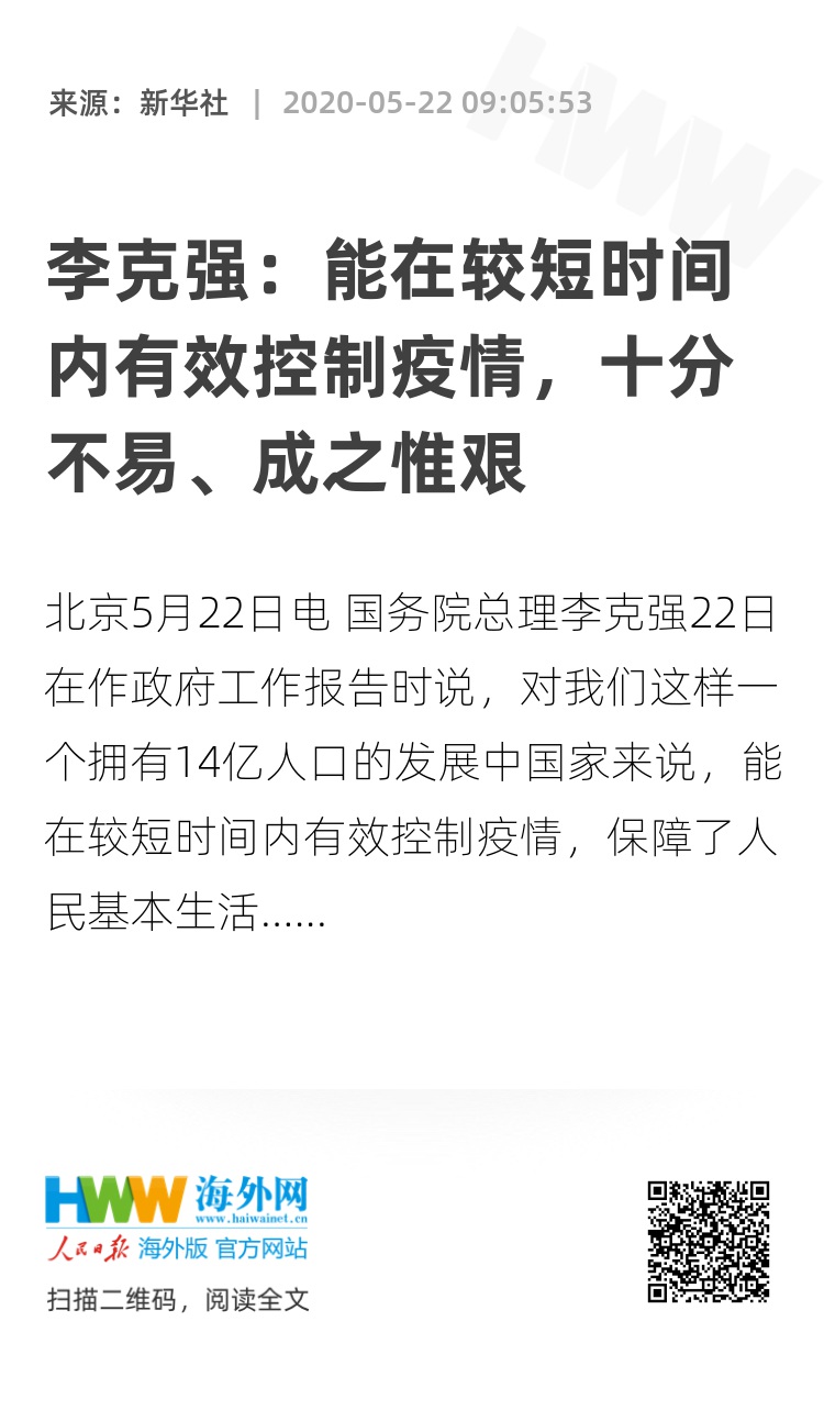 新华社北京5月22日电 国务院总理李克强22日在作政府工作报告时说,对我们这样一个拥有14亿人口的发展中国家来说,能在较短时间内有效控制疫情,保障了人民基本生活,十分不易、成之惟艰。我们也付出巨大代价,一季度经济出现负增长,生产生活秩序受到冲击,但生命至上,这是必须承受也是值得付出的代价。我们统筹推进疫情防控和经济社会发展,不失时机推进复工复产,推出8个方面90项政策措施,实施援企稳岗,减免部分税费,免收所有收费公路通行费,降低用能成本,发放贴息贷款。按程序提前下达地方政府专项债券。不误农时抓春耕。不懈推进脱贫攻坚。发放抗疫一线和困难人员补助,将价格临时补贴标准提高1倍。这些政策使几亿人受益,及时有效促进了保供稳价和复工复产,我国经济表现出坚强韧性和巨大潜能。