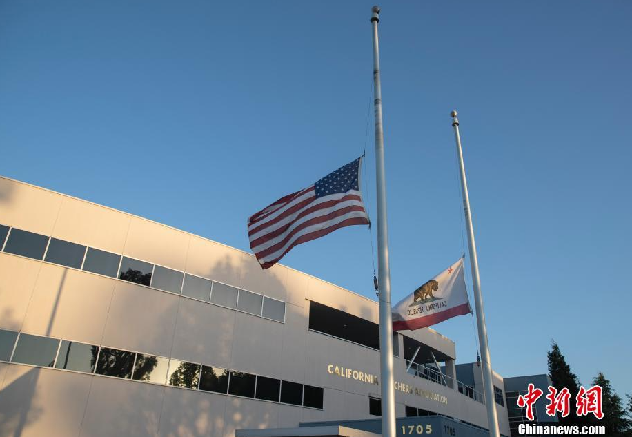 当地时间5月22日,位于美国加利福尼亚州圣马特奥县的加州教师协会门前,美国国旗和加州州旗均被降到旗杆一半的位置。美国总统特朗普21日晚发布公告,全美自22日起降半旗三天,向新冠肺炎逝者致哀。 中新社记者 刘关关 摄