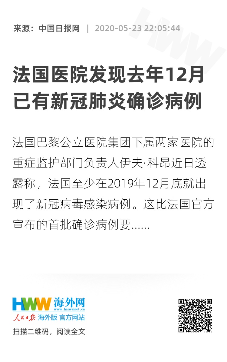 法国巴黎公立医院集团下属两家医院的重症监护部门负责人伊夫·科昂近日透露称,法国至少在2019年12月底就出现了新冠病毒感染病例。这比法国官方宣布的首批确诊病例要早近1个月。
